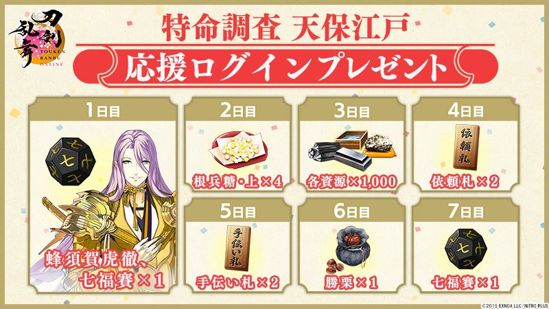 「特命調査 天保江戸」の開催期間中、ゲームにログインした全ユーザーを対象に、「特命調査 天保江戸」にゆかりのある刀剣男士「蜂須賀虎徹(cv. 興津和幸)」や「特命調査 天保江戸」専用便利道具などを最大7日(7回)プレゼントする。