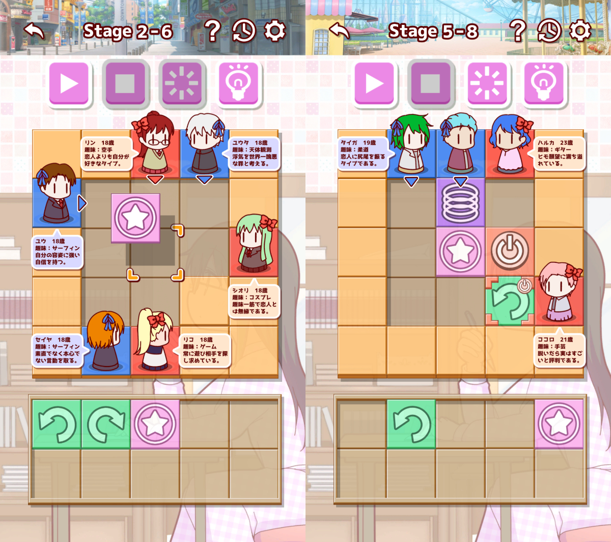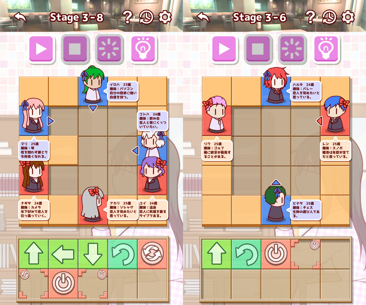 本作は、カップルを作るパズルゲーム。3×3のフィールドに、様々な効果を持つパネル(右へ進む、左折する、ワープする、など)をうまく配置することで、恋する2人の出会いを演出する。