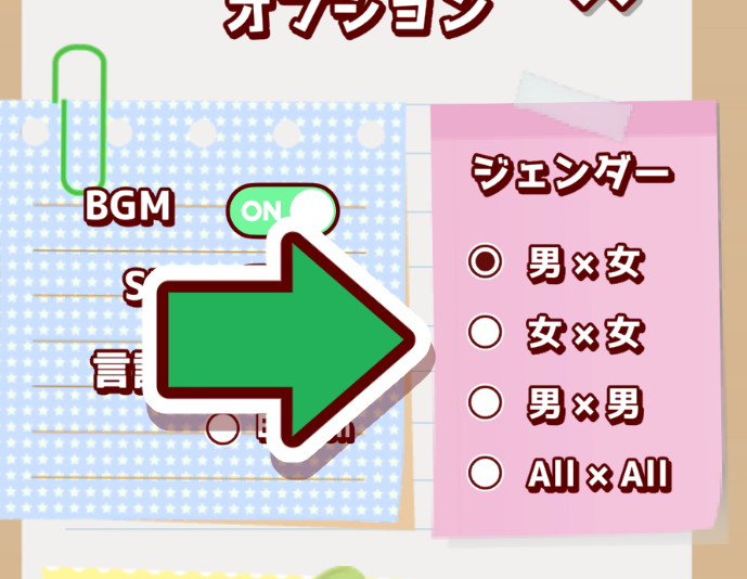 本作品ならではの特徴として、ジェンダーの設定機能が挙げられる。初期状態では男の子と女の子でカップルを作るようになっているが、これを男の子同士、女の子同士などに変更することができる。また、性に関するさらに細かな設定を行うオプション(要アプリ内課金)も用意しており、様々な価値観を持つ方に満足できるようになっている。