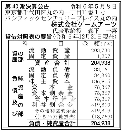 ゲームアーツの2023年12月期(第40期)の決算は、最終損失が1300万円と赤字転落となった。前の期(2022年12月期)の実績は、最終利益が200万円だった。本日(5月8日)付の『官報』に掲載された「決算公告」で判明した。
