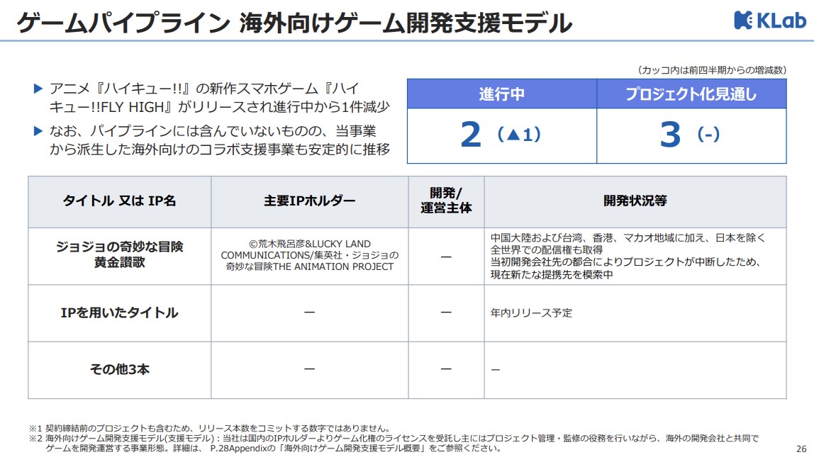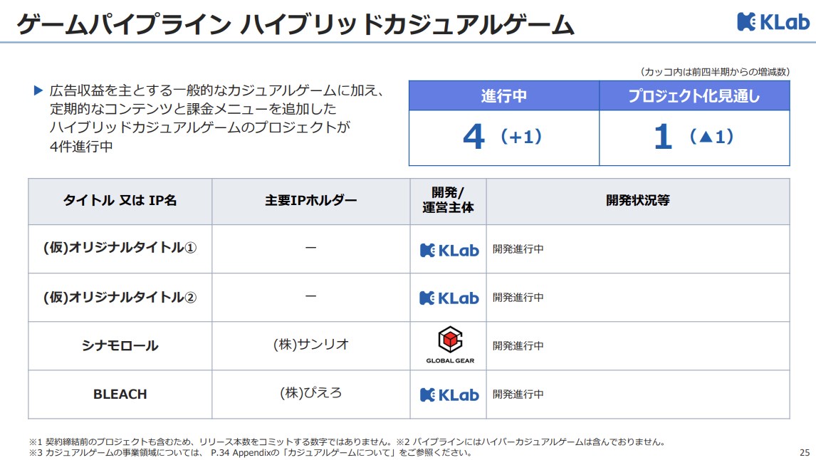 KLabの決算説明資料より…新作パイプラインは「BLEACH」初の完全新作ハイブリッドカジュアルゲームが追加に 『ハイキュー!!FLY HIGH』は2Qより収益貢献へ