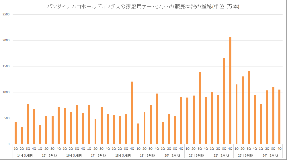 バンダイナムコホールディングス<7832>の第4四半期(2024年1~3月)の家庭用ゲームソフトの売上高は、前年同期比41.0%増の485億円と大きく伸びたことがわかった。『ELDEN RING』が大ヒットした2022年3月期第4四半期に次ぐ売上となる。同社がこの日(5月9日)発表した2024年3月期の決算補足資料で計算した。