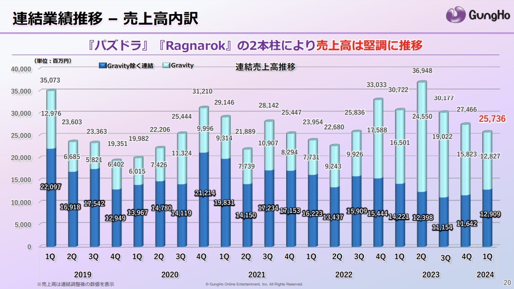 また、例年の第1四半期は『パズル&ドラゴンズ』の周年イベントの開催で、ユーザーアクティビティが伸長するものの、「魔法石」の無料配布の影響で売上は落ち込む傾向があるが、12周年を迎えたこの四半期のGravityの貢献分を除いた売上高はQonQで10.9%増となっており、『パズドラ』は想定よりもやや強含みの推移になっているとみることができそうだ。