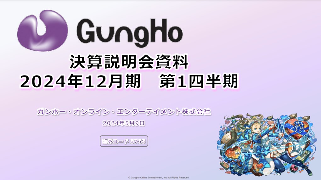 ガンホー・オンライン・エンターテイメント<3765>は、5月9日に2024年12月期の第1四半期(1~3月)の連結決算を発表した。今回はその決算説明資料から第1四半期決算の四半期推移(QonQ)での状況を見てみたい。
