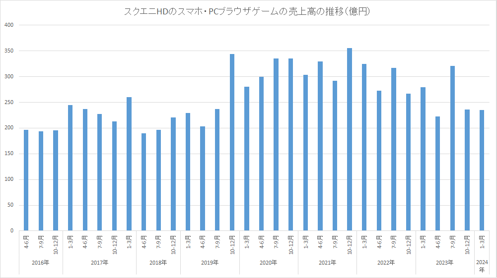 スクウェア・エニックス・ホールディングス<9684>は、この日(5月13日)、2024年3月期の決算説明資料を公開し、「スマートデバイス・PCブラウザ等」の売上高が前の期比10.6%減の1015億円、営業利益が同12.3%減の142億円だったことを明らかにした。同社は初めて営業利益を開示した。人によって受け止め方は様々だろうが、予想以上に利益が出ていると感じた人は少なくないではないか。
