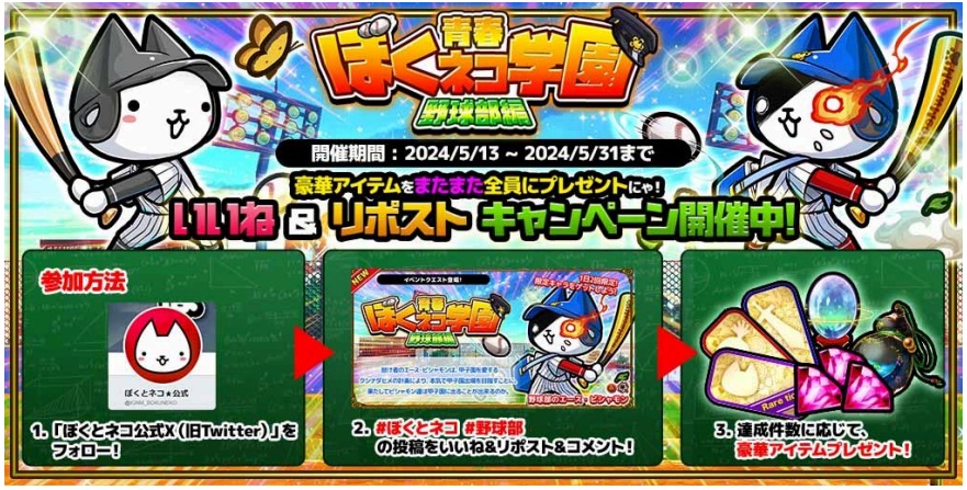 イグニッション・エムは、2024年5月13日(月)より、iOS、Android向けゲーム「ぼくとネコ」で、新シリーズ「ぼくネコ学園」の5月イベント「野球部編」を開始した。