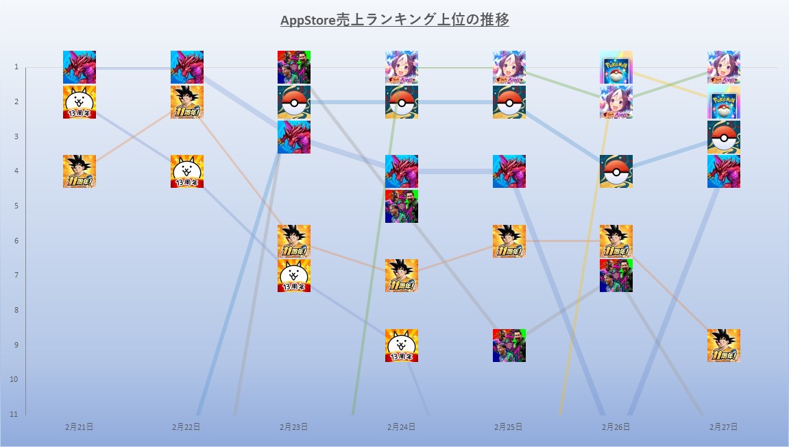 | 17 | ↑2 | ロマンシング サガ リ・ユニバース | スクウェア・エニックス<9684>/アカツキゲームス<3932> |