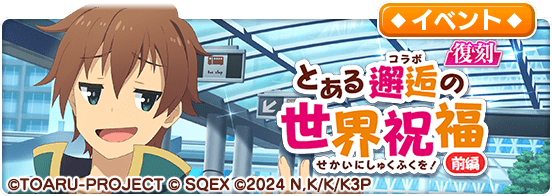 アニメ『この素晴らしい世界に祝福を!』との復刻コラボイベント開催を記念して、「とある邂逅の世界祝福[前編]復刻ガチャ」を上記期間中設置する。本ガチャからは、コラボ限定キャラクターとして★3バトルキャラ「【アークプリースト】アクア」や「【アークウィザード】めぐみん」、★3アシストキャラ「【紅魔族の族長の娘】ゆんゆん」が復刻登場する。さらに、アクアの衣装を身に着けたコラボ限定★3バトルキャラ「【花鳥風月】御坂 美琴」が新登場する。