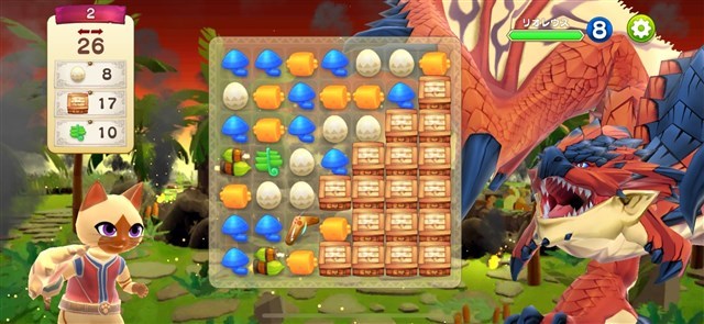 もちろん、ステージによっては『モンスターハンター』に登場する人気大型モンスターも多数登場する。モンスターは一定ターン数が経過することで攻撃を仕掛けてくるのだが、敵の攻撃により特定のピースが動かせなくなったり、特定のピースが消されてしまったりなど非常に厄介だ。なお、モンスターの種類は今後のアップデートで随時追加されていく予定とのこと。
