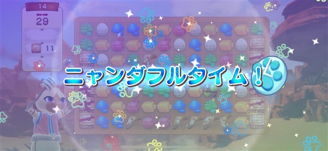 さらに、6コンボ以上で登場するコンボルーレットが当たりのマスに止まると「ニャンダフルタイム」が発生。「ニャンダフルタイム」中は、制限時間内であればピースの配置を無限に変更できる。「ニャンダフルタイム」終了時にマッチしたピースが一気に解放されるため、一度に多くのピースを消したり、コンボを繋げたりしやすくなる。