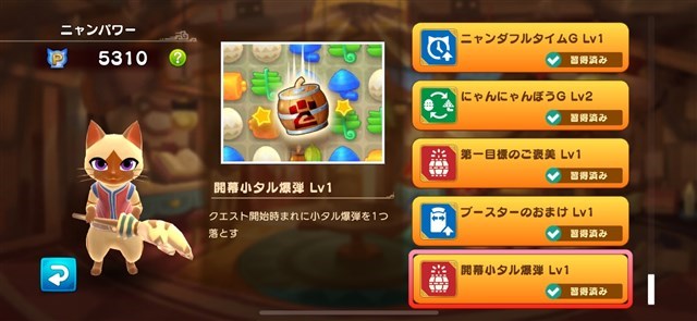 クエストクリアや衣装収集、アイルーの入手数により上昇する「ニャンパワー」を上げれば、お助けアイテムのレベルが上がって効果がより強力なものになるほか、クエスト中に自動で発動するスキルを習得することができる。