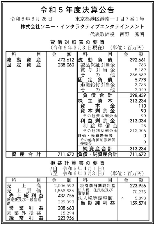 ソニー・インタラクティブエンタテインメント(SIE)の2024年3月期の決算は、売上高2兆0065億9200万円(前の期比7.0%減)、営業利益2086億6300万円(同206.6%増)、経常利益2239億5600万円(同65.2%増)、最終利益1595億7400万円(同36.9%増)だった。6月26日付の『官報』に掲載された「決算公告」で判明した。