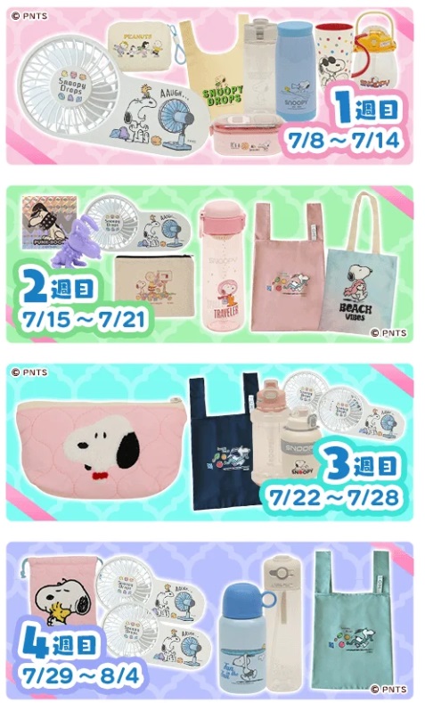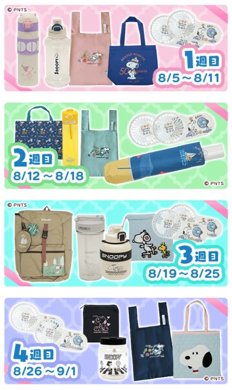 毎週抽選で夏にぴったりなスヌーピーグッズが当たるので欲しいグッズを選んで応募しよう。