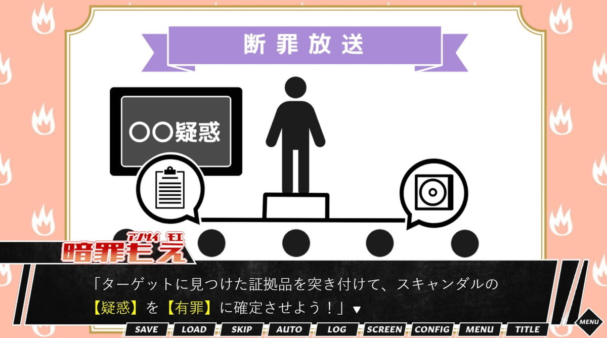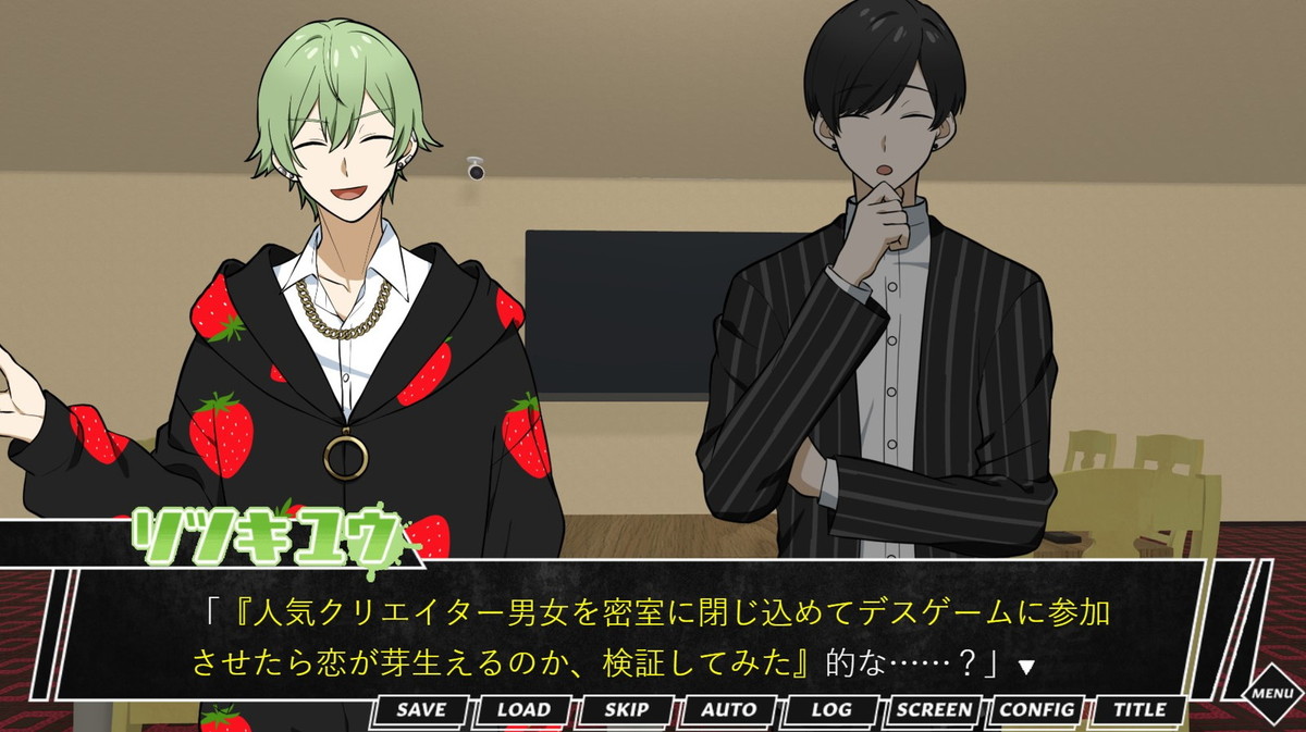 本作は、建物内の証拠品を集めて人気クリエイター達の炎上スキャンダルを暴くデスゲームADV。さまざまな箇所をクリックして調べたり、謎を解いたり、他の参加者に話しかけることでストーリーが進行する。