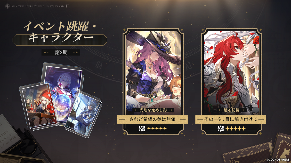 同時開催のイベント跳躍・光円錐「光陰を定めし影」では、限定星5光円錐「されど希望の銘は無価(知恵)」の出現率がアップ!そして「遡る記憶」では限定星5光円錐「その一刻、目に焼き付けて」が再び登場。