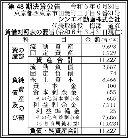 シンエイ動画の2024年3月期(第48期)の決算は、最終利益が前の期比34.0%減の10億2300万円と減益だった。前の期(2023年3月期)の実績は、最終利益15億5000万円だった。7月17日付の『官報』に掲載された「決算公告」で判明した。