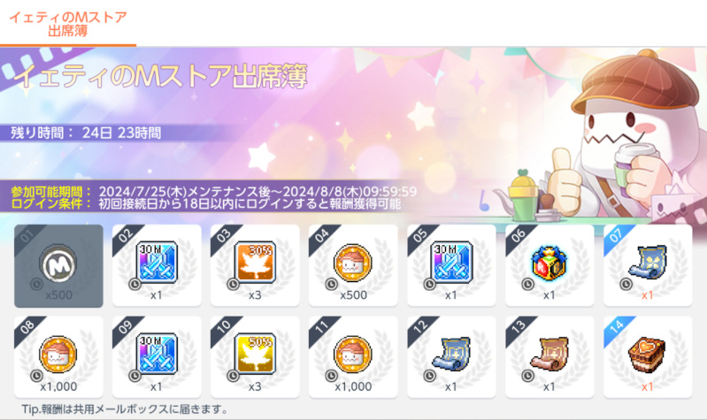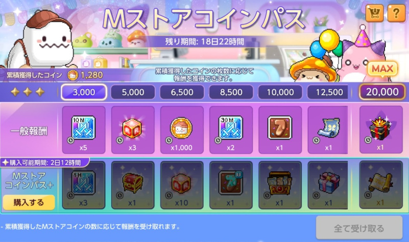 Mストアコインの累積獲得数に応じて、様々な報酬を受け取れる「Mストアコインパス」を開催。一般報酬では、「ミルクチョコダメージスキン」や「ボスアクセサリー選択ボックス」などが手に入る。さらに、期間限定の「Mストアコインパス+」を購入すると、追加報酬としてセーフティーシールドとプロテクトシールドが7個ずつ入った「特急強化支援ボックス」や、「スターフォース★+1確率強化100%クーポン(★20~29)」なども獲得できる。