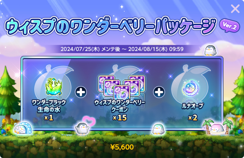 「ウィスプのワンダーベリー」販売に合わせて、ウィスプのワンダーベリークーポン15個と、ワンダーブラック生命の水1個、ルナオーブ2個がセットになった、お得なパッケージも登場。