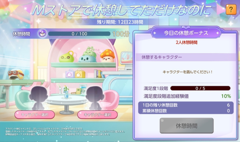 キャラクターを選択し放置するだけで、経験値が受け取れるイベント。2キャラ同時に参加できるので、キャラのレベルアップに役立ておう。