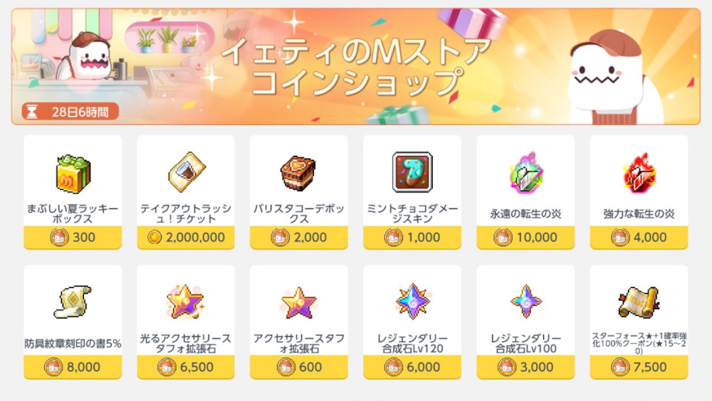 イベントで集めた「Mストアコイン」は、専用のコインショップで様々なアイテムと交換できる。ここでしか入手できないコーデアイテムのほか、永遠の転生の炎や謎のモンスターエッグなどの貴重なアイテムも手に入れよう。