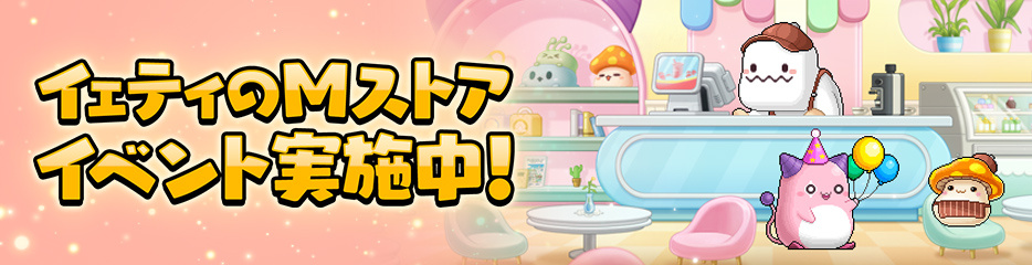 本日より開催するイベント「イェティのMストア」では、イベントやミニゲームへの参加、フィールドでの狩りなどで手に入るアイテム「Mストアコイン」を集めて、専用のコインショップでイベント限定アイテムや貴重なアイテムなどと交換することができる。