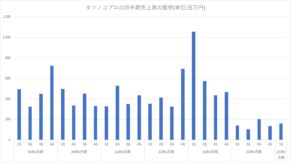 タツノコプロの第1四半期(24年4~6月)の決算は、売上高が前年同期比14.1%増の1億6200万円、営業損失2300万円(前年同期900万円の損失計上)と増収・赤字幅拡大となった。6四半期連続の営業損失計上となった。
