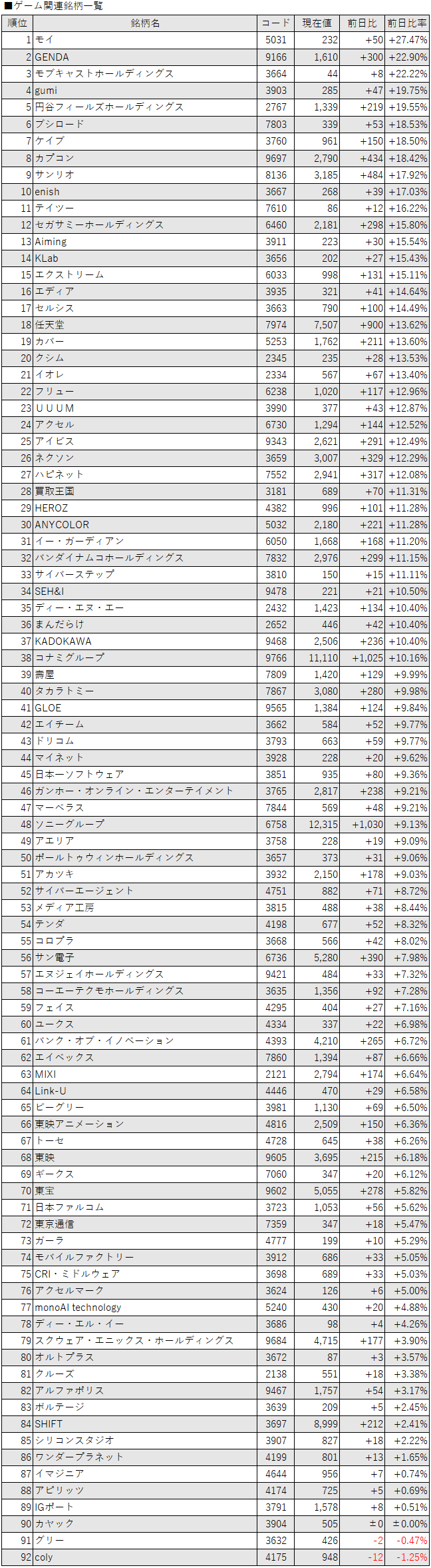 こうしたなか、ゲーム・エンタメ関連企業をみると、登録されている92銘柄のうち、上昇は89銘柄(97%)、下落は2銘柄(2%)、変わらずは1銘柄(1%)で、上昇した銘柄のほうが多かった。個別銘柄にコメントするべきことはなく、市場全体と同様、自律反発狙いの買いが幅広く入り、全面高商状となった。ただグリー<3632>とcoly<4175>がマイナスで引けた。