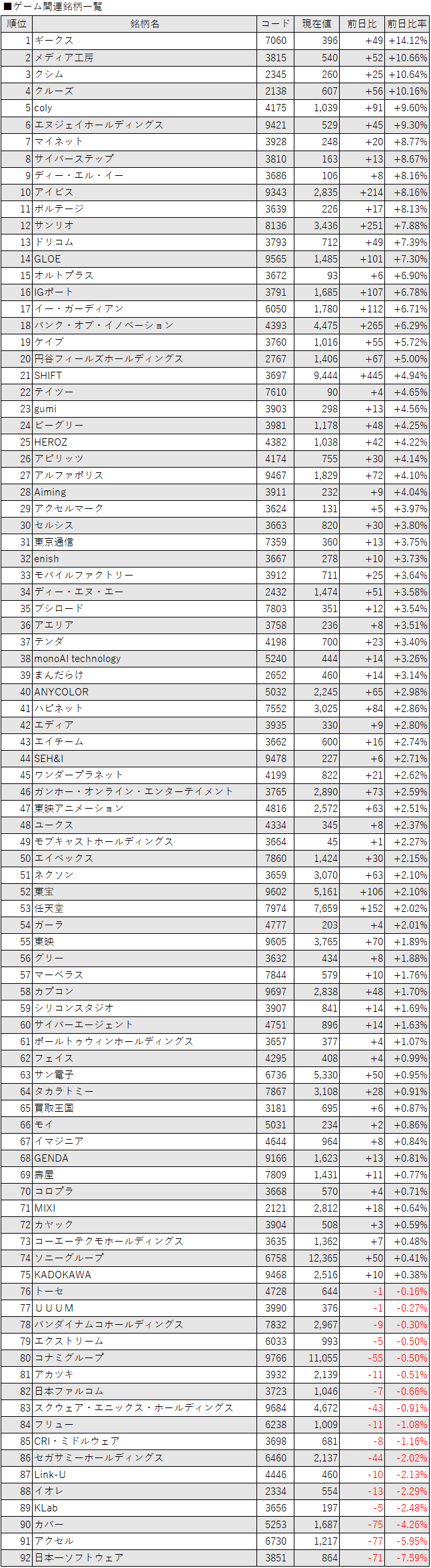 こうしたなか、ゲーム・エンタメ関連企業をみると、登録されている92銘柄のうち、上昇は75銘柄(82%)、下落は17銘柄(18%)、変わらずは0銘柄(0%)で、上昇した銘柄のほうが多かった。