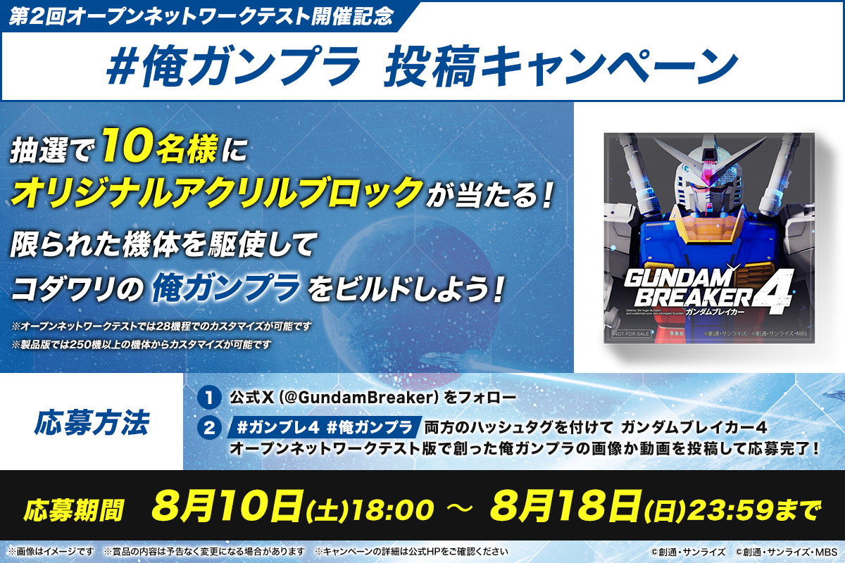 『ガンダムブレイカー4』公式X(@GundamBreakers)で、「第2回オープンネットワークテスト開催記念 #俺ガンプラ 投稿キャンペーン」を実施する。8月10日、8月11日に開催される『ガンダムブレイカー4 オープンネットワークテスト版』で創った、俺ガンプラの画像 または 動画を指定のハッシュタグをつけてXに投稿した人の中から、抽選で10名に「ガンダムブレイカー4 オリジナルアクリルブロック」をプレゼントする。