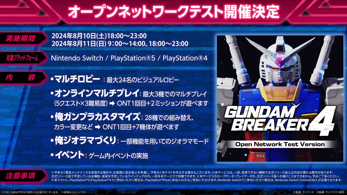 2024年8月10日18:00~23:00、8月11日9:00~14:00月1日 8:00~23:00に、第2回オープンネットワークテストを開催する。本ネットワークテストでは、『ガンダムブレイカー4』から追加した新モード「ジオラマモード」を一部機能を制限した状態で楽しめる。