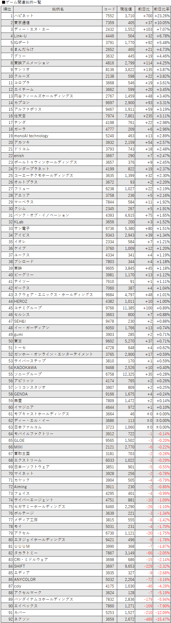 そうした中でゲーム関連株の動きを見てみると、下記の表に登録しているゲーム・エンタメ関連企業92銘柄のうち、上昇は60銘柄(65%)、下落は29銘柄(32%)、変わらずは3銘柄(3%)で、上昇した銘柄のほうが多かった。