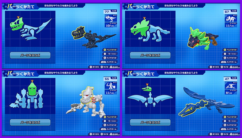 本作Nintendo Switch『ほねほねザウルスX 超合体!ビルド&バトル』も、原作の特徴を最大限に活かし、ゲーム中に手に入れたパーツをプレイヤーが自由自在に組み立て、組みかえてキャラクターを作り、そのキャラクターでアクションバトルを楽しめるようになっている。