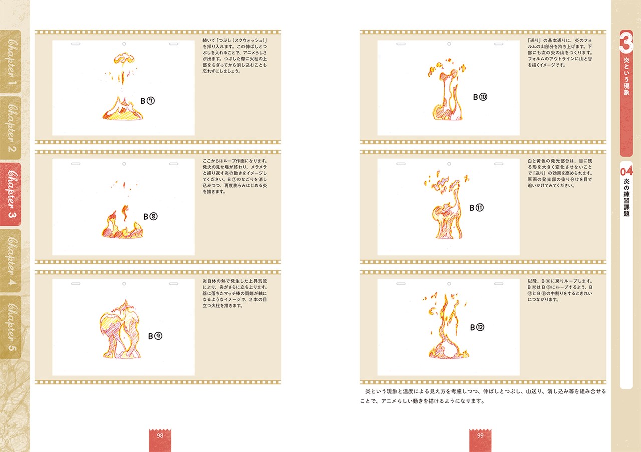 エフェクト作画の書籍といえば原画集が多いが、本書は自然科学などエフェクトの原理を学びエフェクト作画の基礎力を身につけることに重点を置いている。作画への落とし込みから、アニメ作画で描かれることの多い炎・煙・爆発について解説している。要所要所で作例があり、QRコードから参考動画もすぐに確認可能で、学んで描いて見てエフェクトを身につけることができる。
