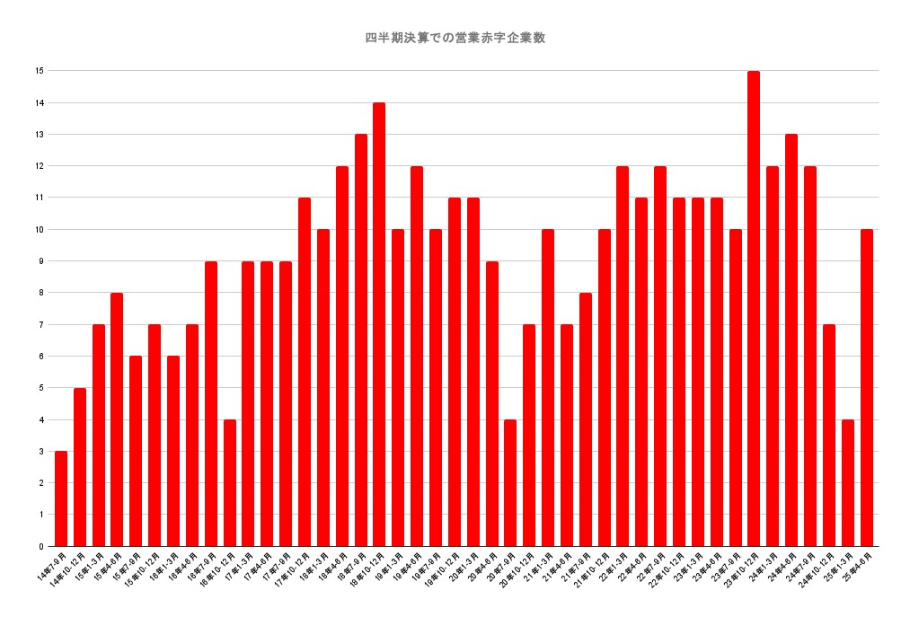この四半期に営業赤字を計上した企業は、データ集計対象の36社中、13社となった。前四半期の12社から1社の増加となる。なお、この四半期は5社が営業黒字転換を果たした一方で、新たに6社が営業赤字に転落している。