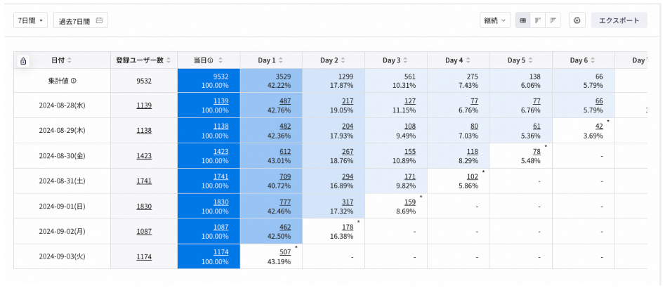 他の分析ツールにおいても往々にして新規ユーザーの継続率は標準化されている。日本市場においては単に継続率やRRというと、この指標を指すことが多い。単純化すると以下のように捉えられる。