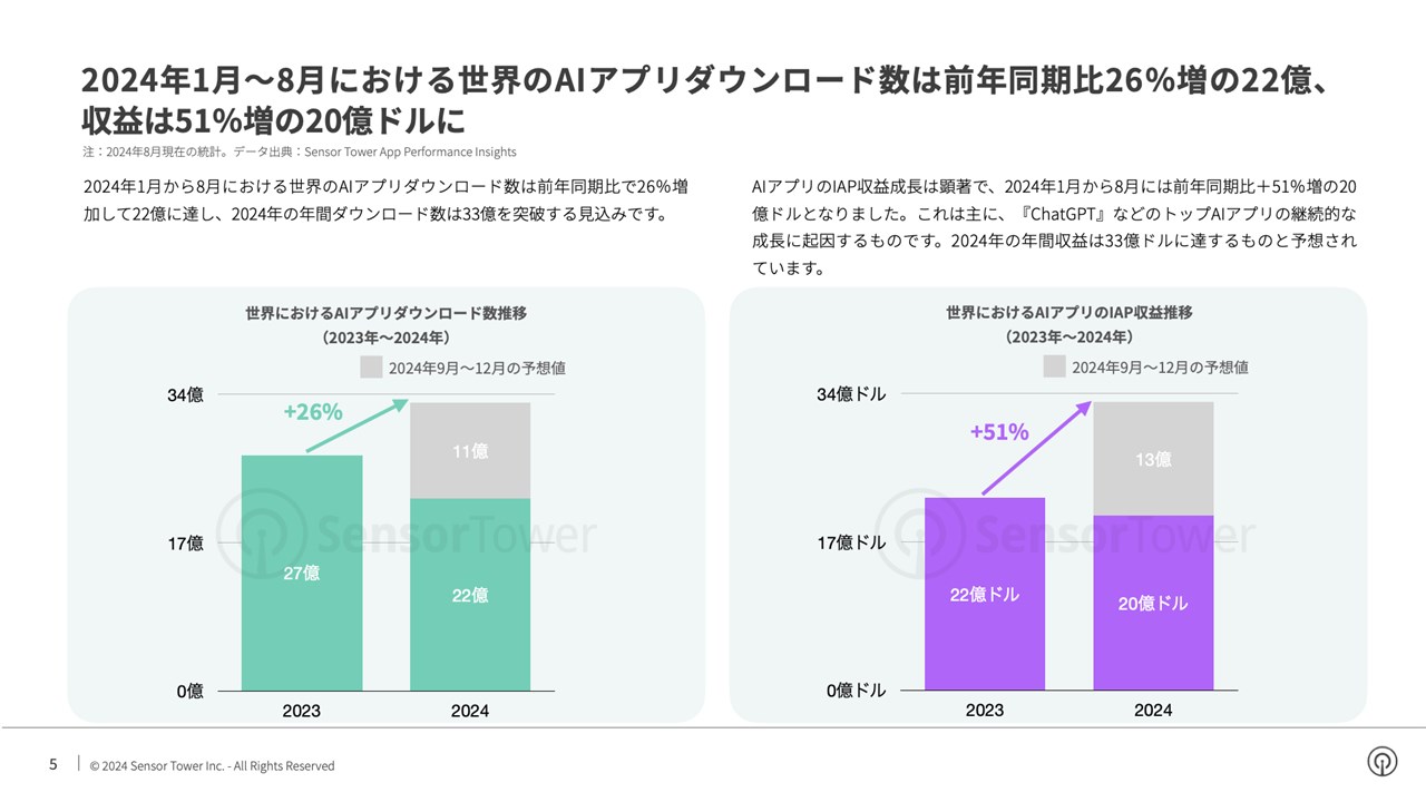 2023年は、世界のAIアプリが爆発的に成長した1年となった。2024年は、トップAIアプリが力強く牽引したことにより、最初の8ヵ月の総収益が前年同期比+51%と急増し、2024年の年間収益は33億ドルに達する見通しだ。