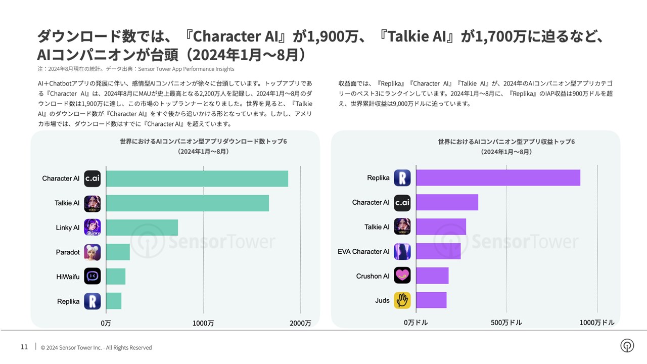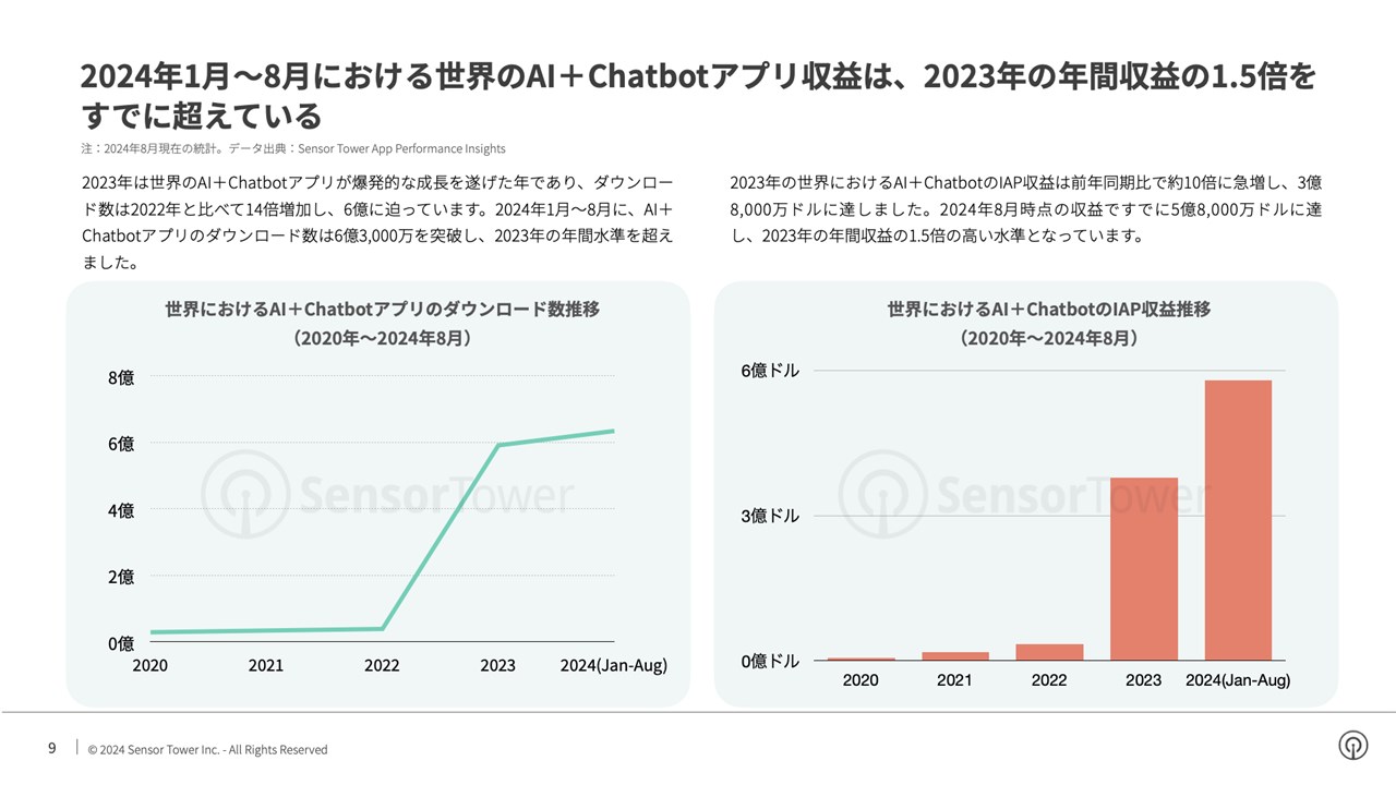 2024年8月時点で、世界のAI+ChatbotアプリのIAP収益は5億8000万ドルに達しており、すでに2023年の年間収益の1.5倍を超える高い水準となっている。