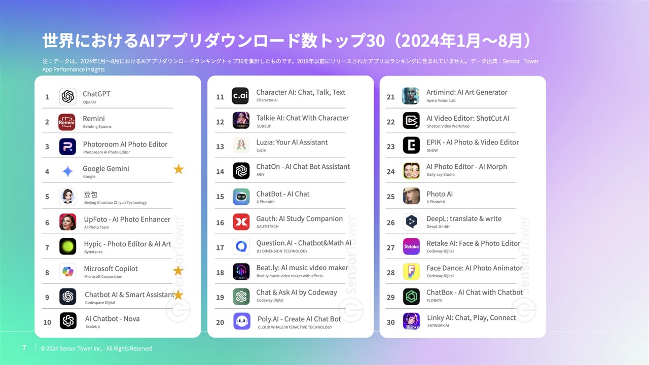 新しく登場した3種類のAIアプリについては、「Google Gemini」が4位、「Microsoft Copilot」が8位、「Chatbot AI & Smart Assistant」は9位にランクインした。