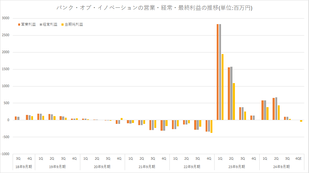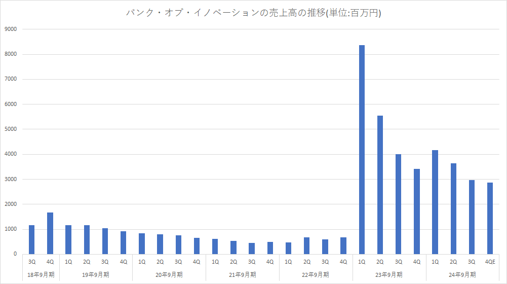バンク・オブ・イノベーション(BOI)<4393>は、9月24日、2024年9月期の連結決算を発表し、売上高136億5000万円(前の期比36.0%減)、営業利益13億4000万円(同72.7%減)、経常利益13億6000万円(同72.4%減)、最終利益8億円(同75.7%減)で着地する見通しと発表した。