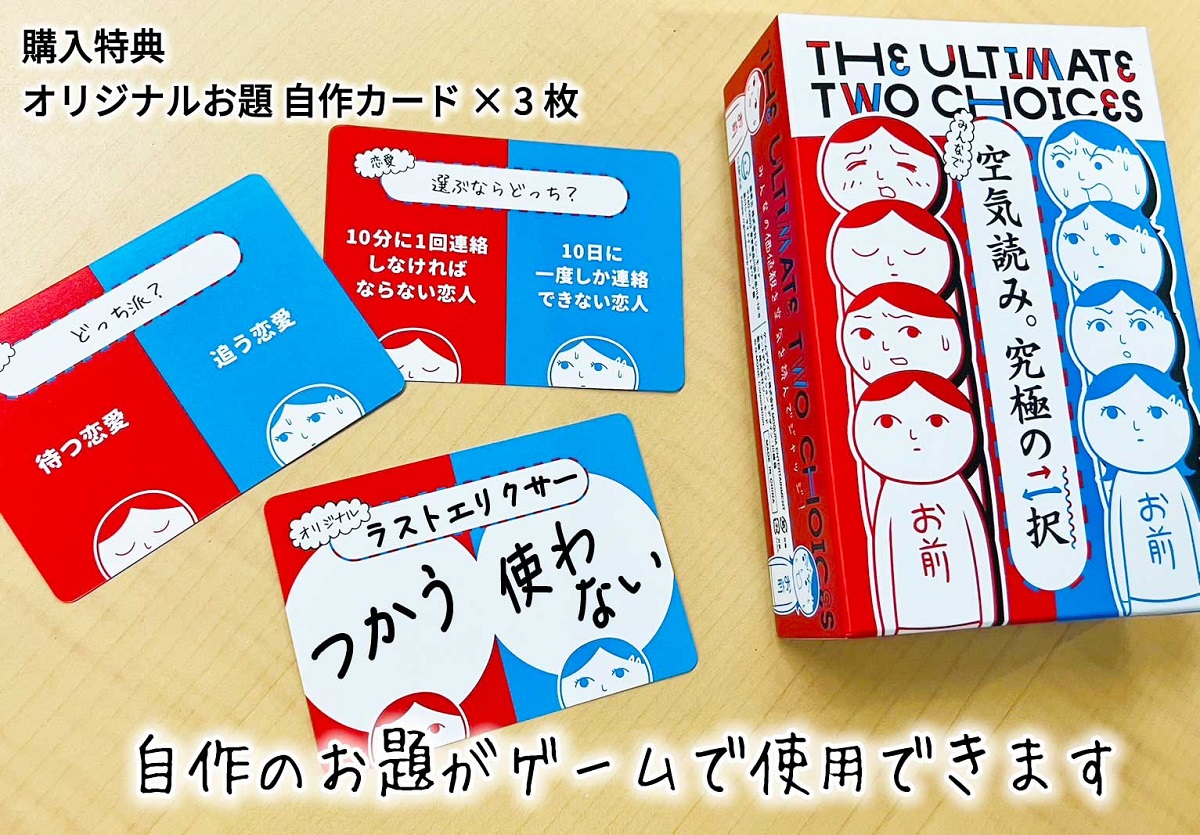 空のカードにテーマにとらわれないオリジナルの「お題」を記入することで、あなたが考案した絶妙な「価値観」をゲームに登場させることができる。一緒に遊ぶプレイヤーの知りたい価値観のお題を作ることも可能。
