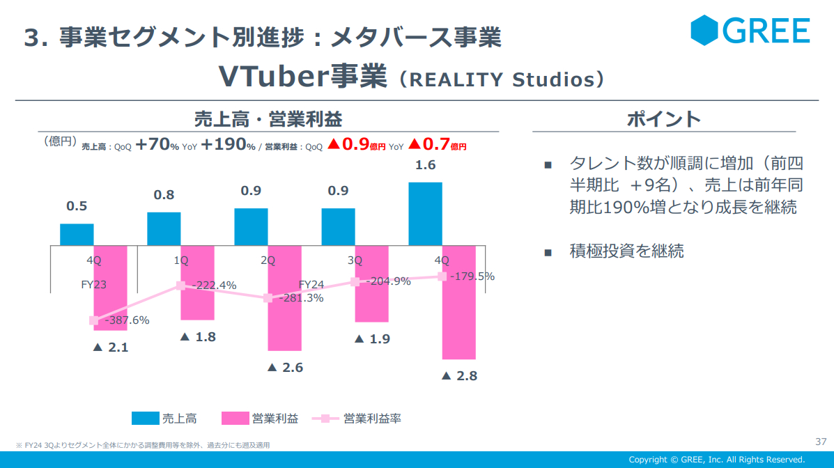 ▲最後はReality Studiosの展開するVtuber事業。こちらは投資先行の状況にあることがわかる。