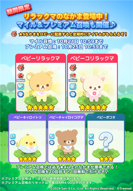 「リラックマ」をはじめとしたキャラクターが「LINE ポコパンタウン」に大集合。「★5 ベビーリラックマ」、「★5 ベビーコリラックマ」、「★4 ベビーキイロイトリ」、「★4 ベビーチャイロイコグマ」