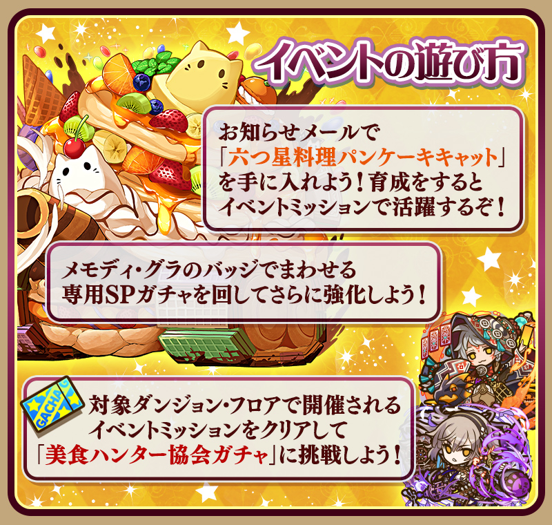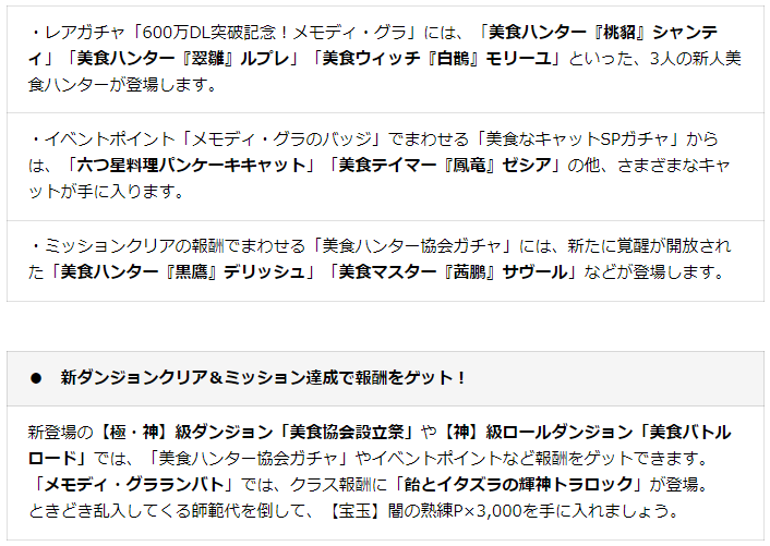 また、新ユニークソウル「美食ハンター会長の証」の登場や、交換所にて「【宝玉】チョウカクチョウ」が毎月1回交換可能になるなど新要素も盛りだくさんでお届け。「600万DL突破記念!メモディ・グラ~6million memorial Summons Halloween~」を楽しもう。