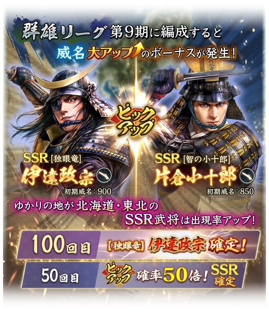 SSR【独眼竜】伊達政宗、SSR【智の小十郎】片倉小十郎がピックアップされる「特別登用・群雄 第9期」を開催する。「特別登用・群雄 第9期」のピックアップ武将はボーナスにより威名が大きくアップするので、上手く活用して、その名を轟かせよう!