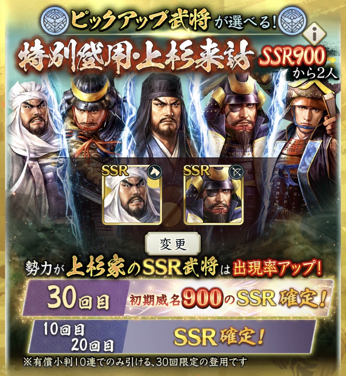 「来訪イベント 第7期 上杉家」にて、来訪者「柿崎景家」「斎藤朝信」2人の親交度を最大にすることで、「特別登用・上杉来訪」が開放される。SSR900武将の中からピックアップ武将を2名選択でき、10回ごとにSSR武将が確定、30回目にはピックアップ武将が確定で入手できる。