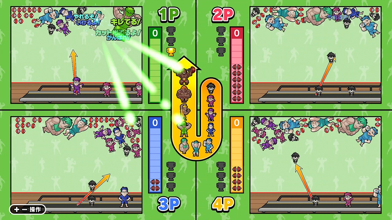他のプレイヤーを邪魔しつつ、発射のタイミングと向きを見極めながら、自分のマッチョを育てて生き残ろう。