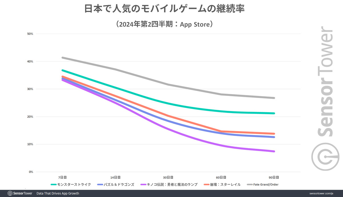 2024年第2四半期の日本のおけるモバイルゲーム収益トップ5は、1位が『モンスターストライク』、2位が『パズル&ドラゴンズ』、3位が『キノコ伝説:勇者と魔法のランプ』、4位『崩壊:スターレイル』、5位『Fate Grand/Order』となっているが、継続率を比較すると、『Fate Grand/Order』の高い継続率が際立って高く「頭一つ抜けている」。
