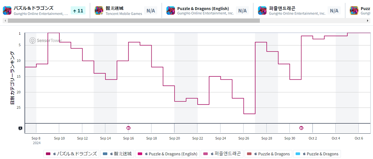 10月7日9時30分現在の国内App Store売上ランキング(ゲームカテゴリー)は、ガンホー・オンライン・エンターテイメント<3765>の『パズル&ドラゴンズ』が首位に立った。