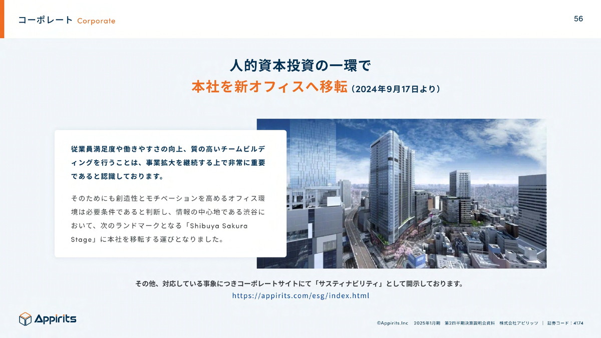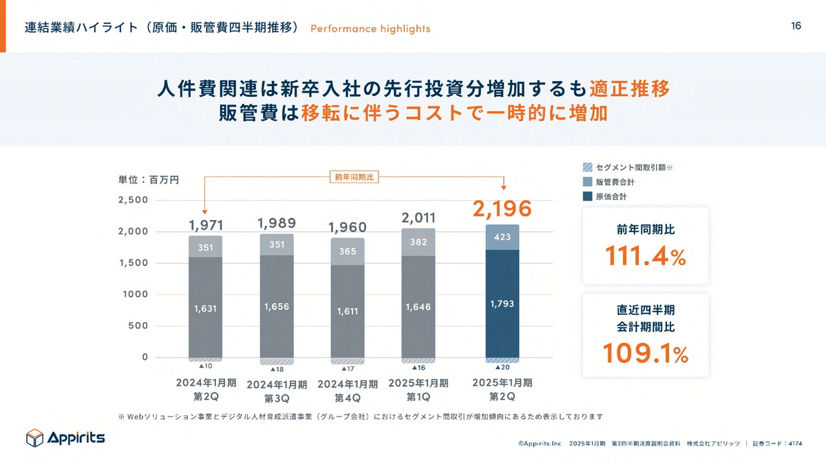 続きましてコストです。コストは、第2四半期では特に新卒入社の先行投資および赤字案件に対して人員を一気に投入したこともありコストの方が増えています。さらに第3四半期に本社移転を今準備しており、そちらに伴うコストも第2四半期に乗っており、一時的に増加しております。