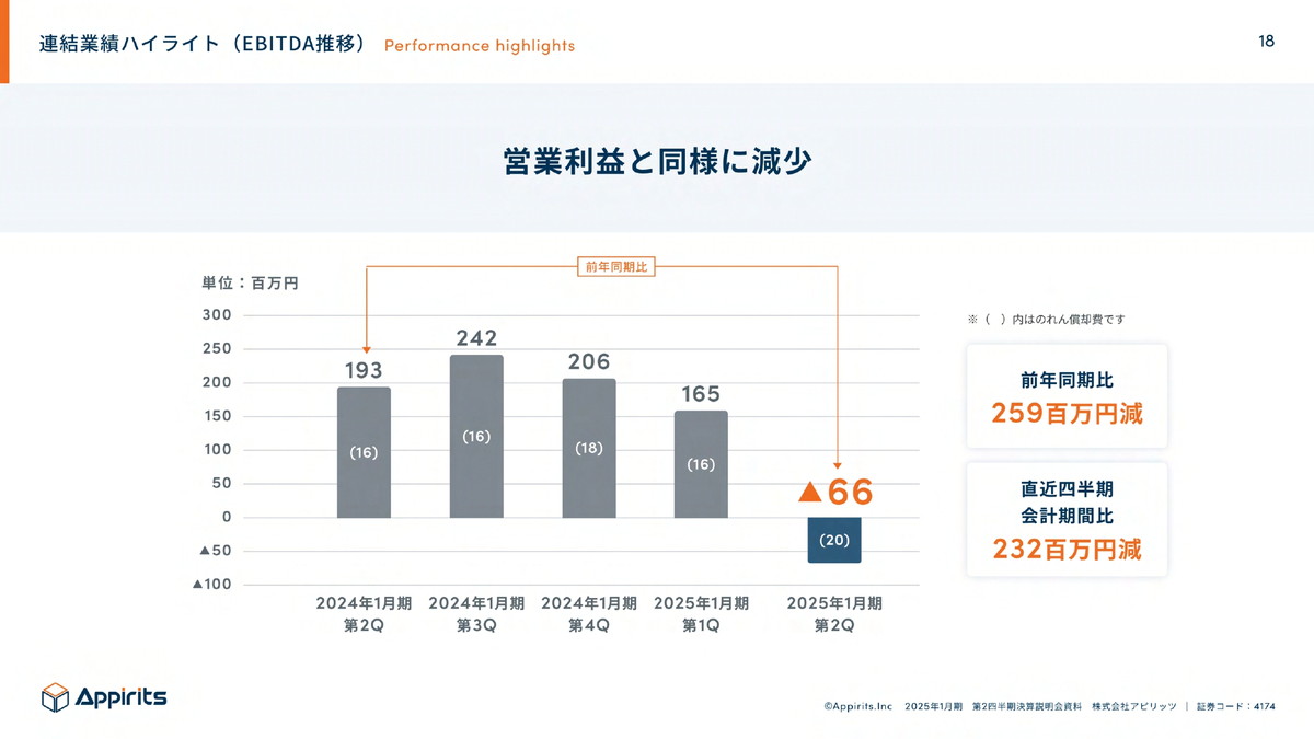 続きましてEBITDAです。こちらも営業利益と同様、減少しているというような状況で着地しております。